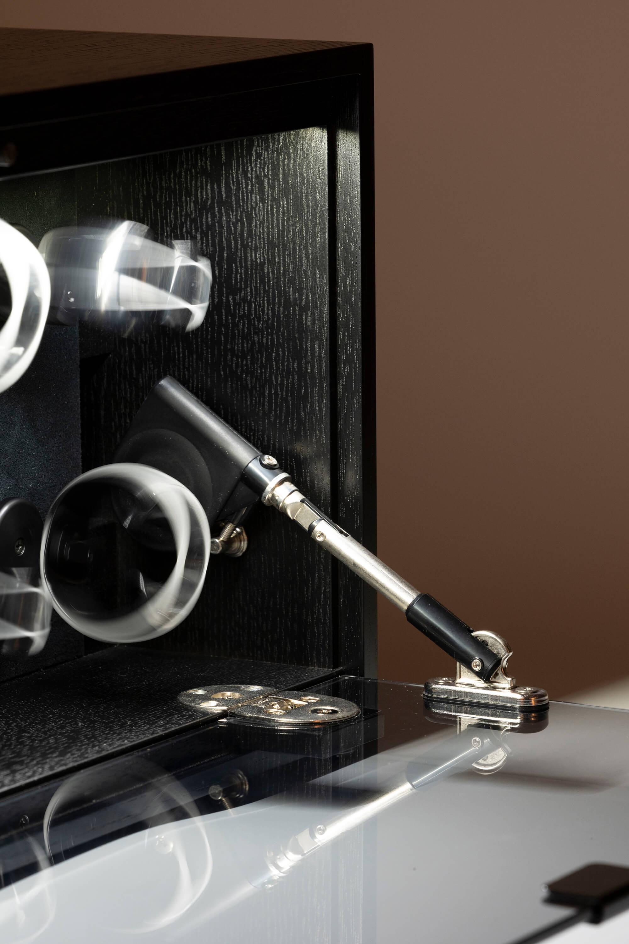 頑丈な5mm厚の飛散防止ガラス扉で大切な時計を埃や湿気などから守り、やわらかなライトが時計を優しく照らし出します。